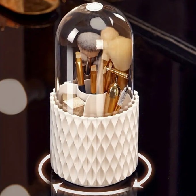 حافظ على فرش مكياجك بشكل آمن ونظيف مع حافظة الفرش المقاومة للغبار. يتميز تصميمها بقابلية الدوران بزاوية 360 درجة، مما يجعلها سهلة الوصول إلى الفرش من جميع الزوايا.